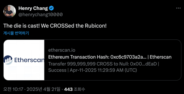 이와 관련해 넥써쓰 장현국 대표는 본인의 X(구 트위터)을 통해 이더스캔 주소를 공유하고 “주사위는 던져졌다. 우리는 루비콘 강을 건넜다”는 글을 남겼다.