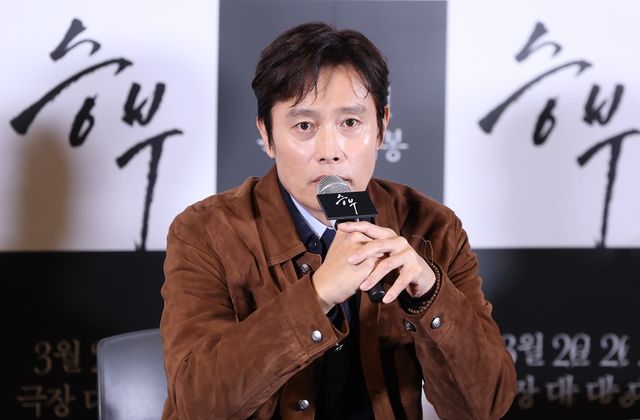 배우 이병헌이 지난달 19일 서울 용산구 CGV용산아이파크몰에서 열린 영화 '승부‘ 언론시사회에 참석해 유아인과의 호흡에 대한 취재진의 질문에 답하고 있다. / 뉴스1