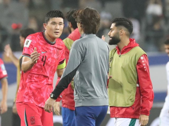 북중미 월드컵 아시아 3차 예선 이라크전 승리 직후 홍명보 감독과 인사 나누는 김민재 / 뉴스1