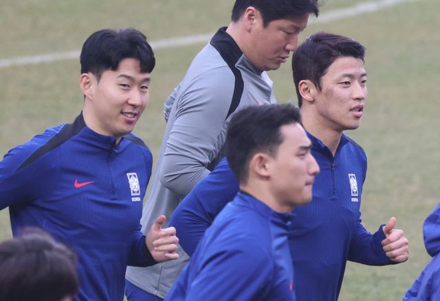 한국 축구대표팀 훈련 중인 손흥민과 황희찬 / 뉴스1