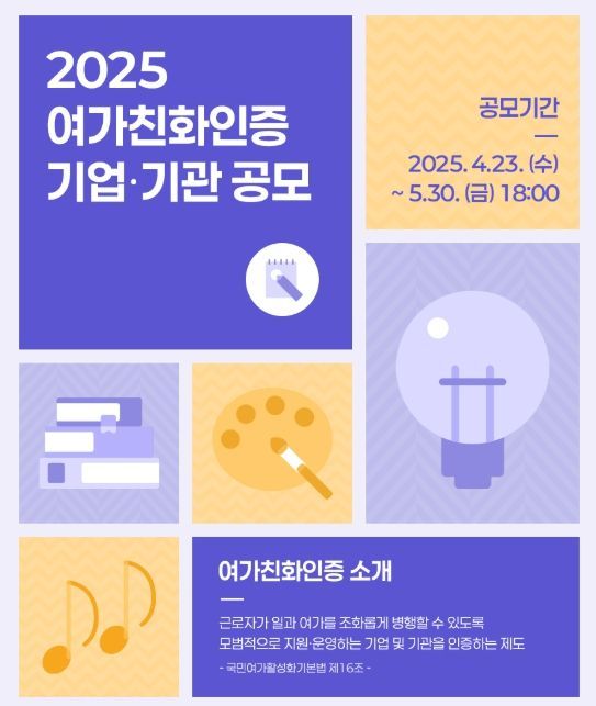 [와이뉴스] 문화체육관광부는 지역문화진흥원과 함께 4월 23일부터 5월 30일까지 근로자들의 ‘일과 여가의 균형’을 지원하는 기업·기관을 대상으로 ‘2025 여가친화인증’ 신청을 받는다.