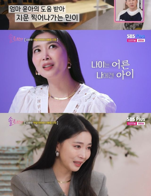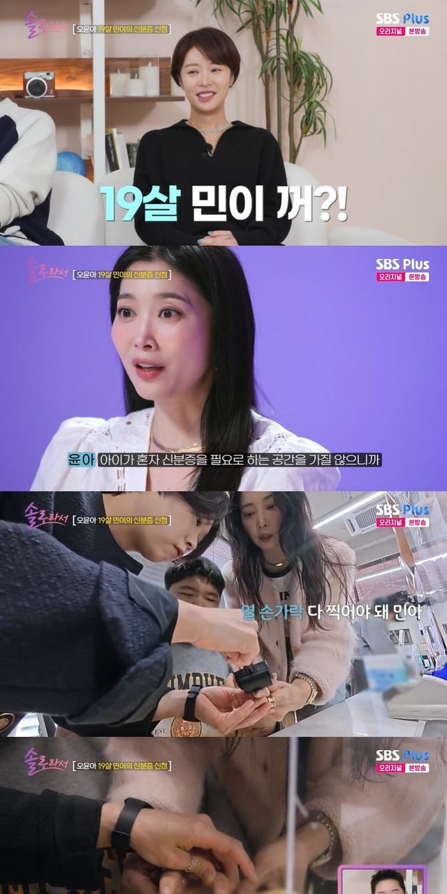 22일 방송된 SBS Plus, E채널 '솔로라서' 16회에서 오윤아는 "아들 주민등록증을 신청하러 왔다"며 19살인 아들 송민의 신분증 발급을 위해 주민센터에 방문했다.