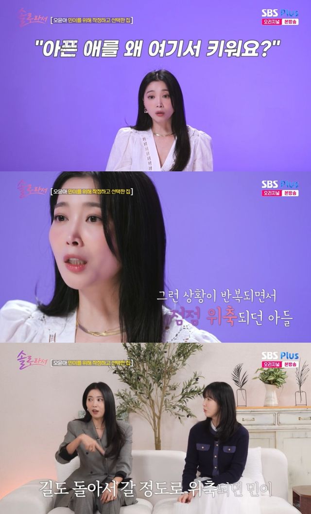 이날 오윤아는 "서울에서 저희 민이를 키울 만한 곳이 없었다. 주변 분들이 너무 불편해하셨다. 아이가 '우~'이러면서 소리를 내니까. '저희 민이가 아파서 그래요' 그러면 '아픈 애를 왜 여기서 키우냐' 그러더라"라며 서울을 떠나 광주에 위치한 3층 단독주택에 살게 된 계기를 밝혔다.