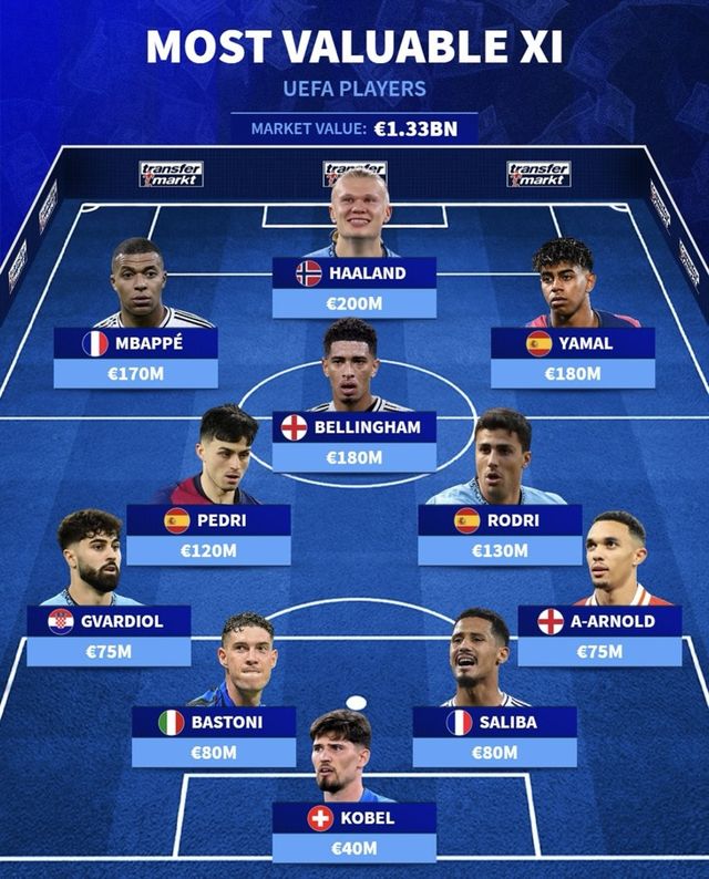 유럽에서 가장 높은 몸값을 자랑하는 건 노르웨이 출신의 엘링 홀란(맨체스터 시티)이다. 시장가치 2억 유로(3249억원)로 평가된다. 홀란과 야말의 몸값을 합치면, 아시아 베스트11 전체 가치를 뛰어넘는다.