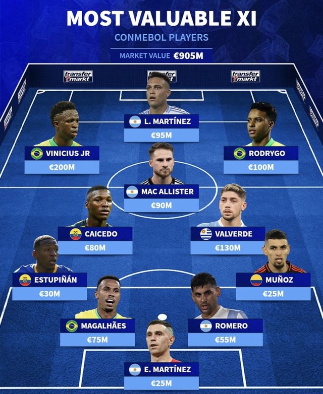 축구 이적 전문 사이트 트랜스퍼마르크트는 23일(한국시간) 시장가치가 높은 선수들로 꾸린 대륙별 베스트11을 공개했다. 각 포지션에서 몸값이 가장 높은 선수들을 배치한 것이다.