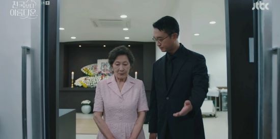 지난주 공개된 1화에서는 본인의 장례식장에서 저승사자를 마주하게 된 이해숙의 모습이 그려졌다. 처음 죽음을 맞이해 혼란스러워하는 이해숙이 “이제 저 어디로 가요?”라고 묻자, 저승사자로 분한 조우진은 “아니, 죽었으니까 천국을 가든 지옥을 가든 하겠죠”라고 쏘아붙이는 등 첫 만남부터 서로 티격태격하는 모습으로 소소한 웃음을 자아내며 극의 재미를 더했다.
