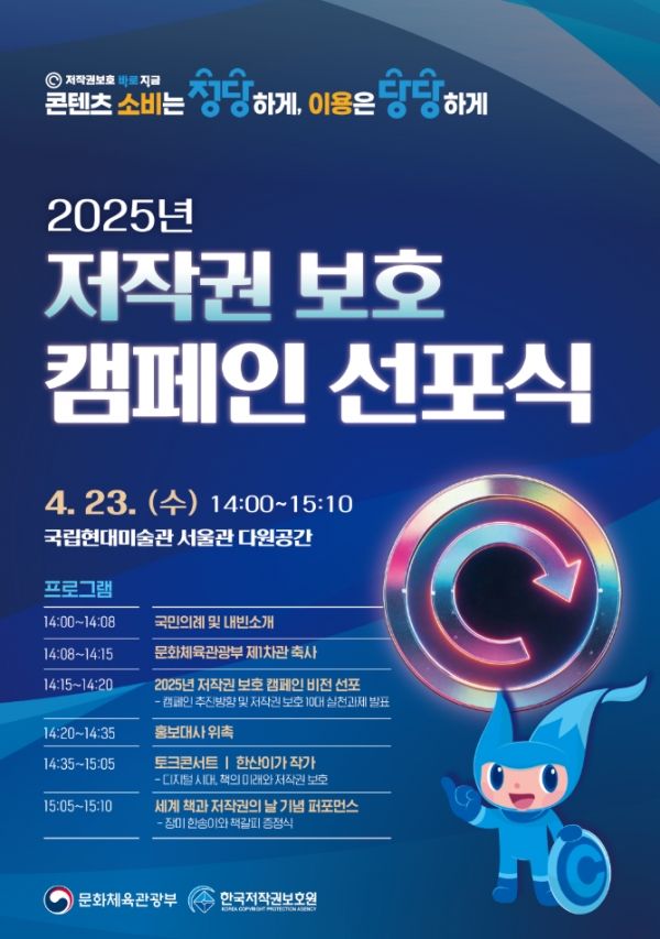 4월 23일은 유네스코가 지정한 ‘세계 책과 저작권의 날(World Book and Copyright Day)’이다. 이에 문화체육관광부(장관 유인촌, 이하 문체부)는 한국저작권보호원(원장 박정렬, 이하 보호원)과 함께 오늘(23일) 국립현대미술관 서울관에서 ‘콘텐츠 소비는 정당하게, 이용은 당당하게’라는 표어로 ‘2025년 저작권 보호 캠페인’의 시작을 알린다.