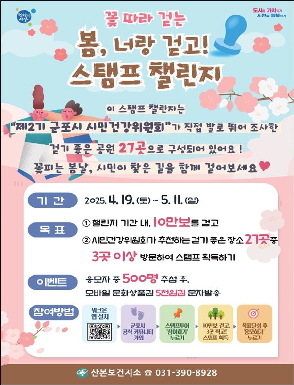 김미경 군포시보건소장은 “시민이 주체가 되어 걷는 길을 함께 만들고 함께 걸어가는 과정이 중요하다”며 “꽃 피는 봄날, 스탬프 챌린지를 계기로 걷기라는 작은 실천이 생활 속 건강한 습관으로 이어지길 기대한다”고 밝혔다.