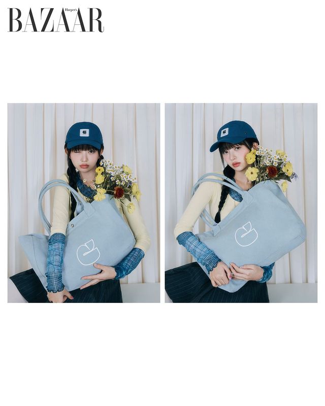 데님 컬러의 ‘뉴 로고’ 에코 백, ‘나일론 스트링’ 캡은 Carlyn.