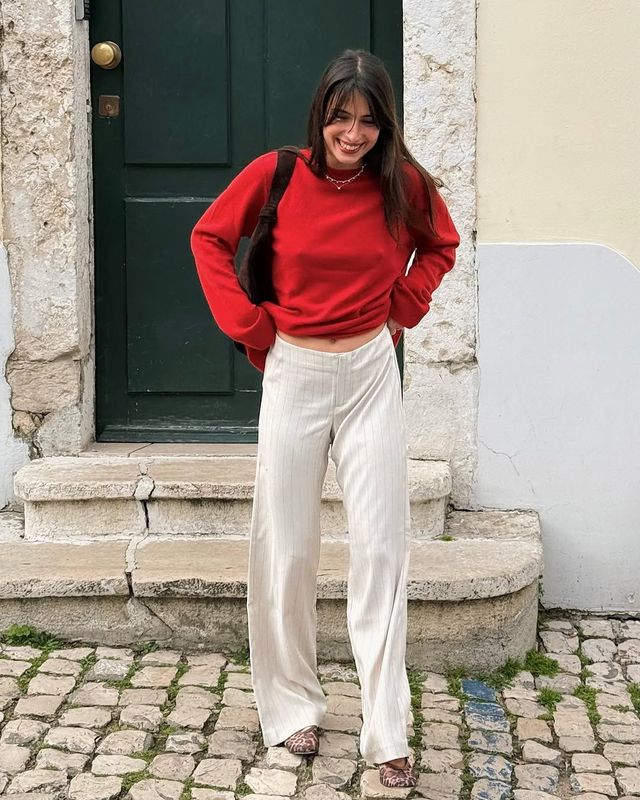 레드 톱을 연출하는 방식도 다양합니다. 타마라 모리와 비키 몬타나리는 크림색 핀 스트라이프 팬츠에 레드 니트를 매치해 손쉬운 데일리룩을 완성했죠. 여기서 조금 더 드레스업하고 싶다면, 구조적인 실루엣의 메탈릭 스커트와 옐로 힐처럼 과감한 포인트를 더해보세요.