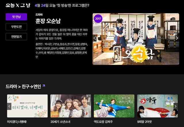 이 중에서도 '오늘X그날' 서비스는 현재 날짜와 동일한 과거 날짜에 첫 방송되거나 방영된 프로그램을 소개하는 '첫 만남', 과거 오늘 방송된 '무한도전' 에피소드를 찾아주는 코너, 국내 최장수 TV 드라마 '전원일기'의 해당 날짜 방송분을 소개하는 코너로 구성됐다.