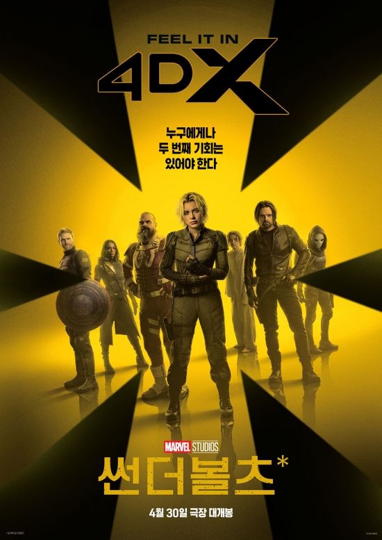 4DX 포맷 포스터에는 우여곡절 끝에 한 팀이 된 ‘썬더볼츠*’ 멤버들의 모습을 담고 있어 이들의 예측 불가 팀플레이가 과연 어떻게 이뤄질지 호기심을 자아낸다. 다양한 모션 효과와 함께 이들의 다이나믹한 액션이 관객들의 오감을 사로잡을 것으로 기대를 모은다.