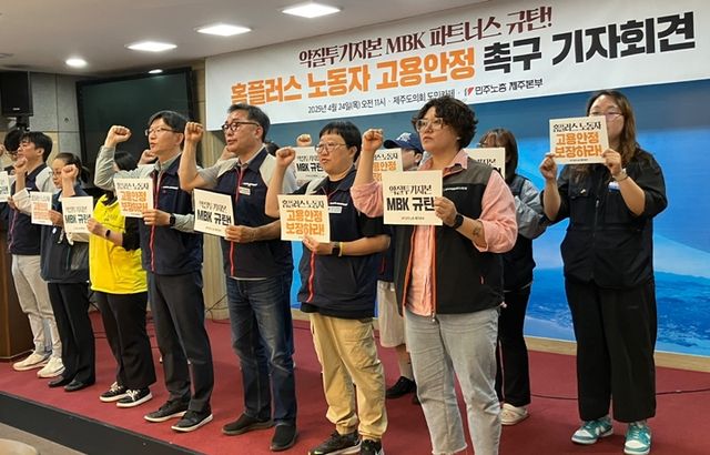 민주노총 제주본부는 24일 제주도의회 도민카페에서 기자회견을 열고 "MBK가 홈플러스 기업회생 신청한지 51일째"라면서 "갑작스러운 기업회생 신청으로 제주 홈플러스 및 입점업체 200여 명을 포함한 전국 10만여명의 노동자가 구조조정의 위협을 받고 있고, 중소상인들 입점업체까지 심각한 생존권 위기로 내몰리고 있다"고 주장했다.