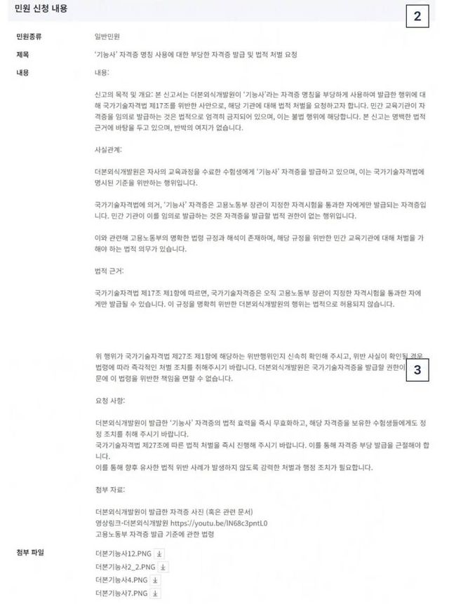 민원인은 "더본외식개발원이 '기능사'라는 자격증 명칭을 부당하게 사용해 발급한 행위에 대해 국가기술자격법 제17조를 위반한 사안으로 해당 기관에 대한 법적 처벌을 요청한다"라며 "민간 교육기관이 자격증을 임의로 발급하는 것은 엄격히 금지되어 있으며 이는 불법 행위"라고 전했다.