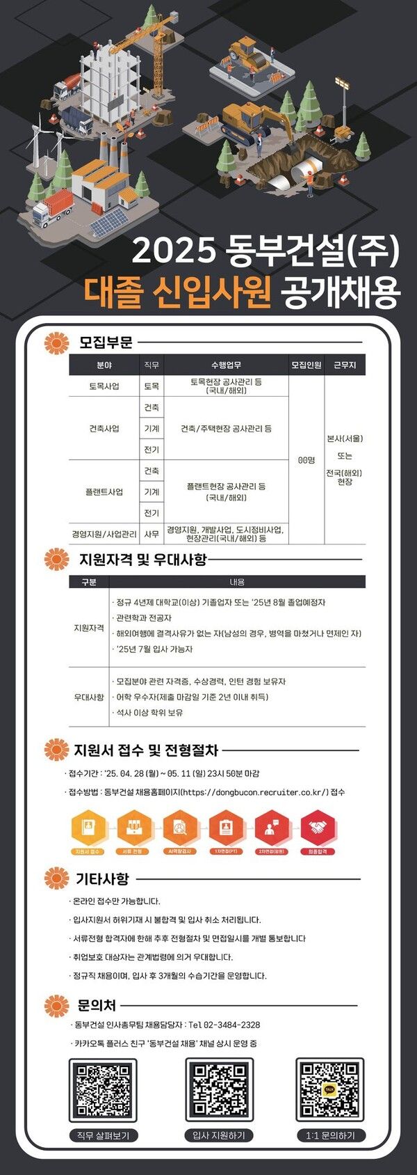 서류 심사를 거쳐 AI 역량검사, 실무진 및 임원 면접 등으로 진행되며 채용 선발된 인원은 입문 교육과정 등을 거쳐 본사와 현장으로 배치될 예정이다. 지원 접수와 관련한 자세한 채용 공고는 동부건설 인재채용 홈페이지와 구인 구직 사이트를 통해 확인할 수 있다.