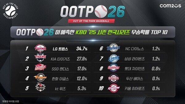 이번 예측은 올해 출시한 ‘OOTP 26’의 최신 데이터를 기반으로 시뮬레이션 1천 회에 걸쳐 이뤄졌다. 그 결과 KBO 리그 한국시리즈 우승은 약 35%의 확률로 ‘LG 트윈스’가 차지했으며, 지난해 우승팀인 ‘KIA 타이거즈’가 약 28%로 근소한 차이를 보였다. 올해 신구장을 개장한 ‘한화 이글스’도 12%의 확률로 예측됐다.