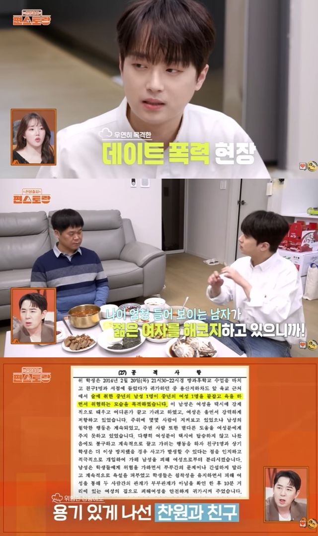 학창시절 야간 자율학습 뒤 친구를 만나러 가던 이찬원. 지하차도를 지나 국밥집 앞에서 취객과 실랑이를 벌이던 여성을 발견했다고. 우연히 데이트 폭력 현장을 목격한 것.