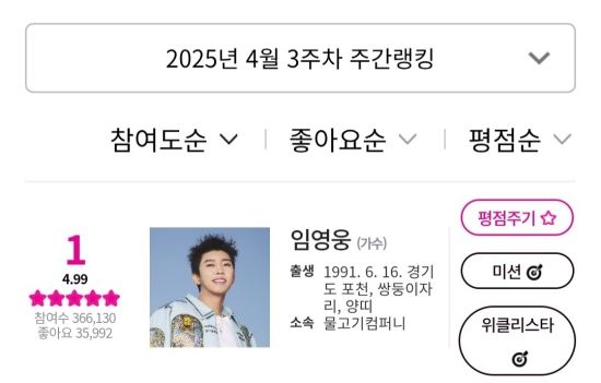 아이돌차트에 따르면, 지난 4월 18일부터 4월 24일까지 집계된 평점랭킹에서 임영웅은 36만 6,130표를 얻어 최다득표를 기록했다.
