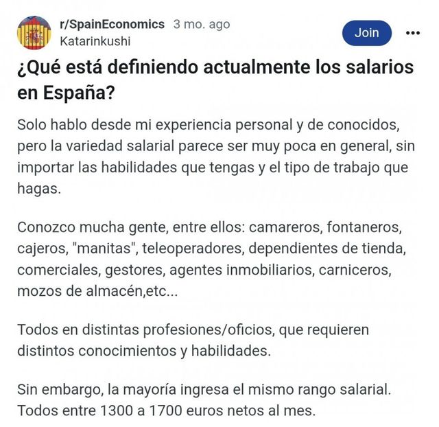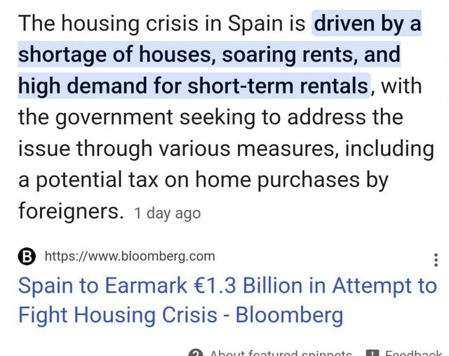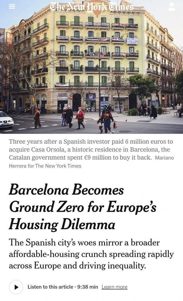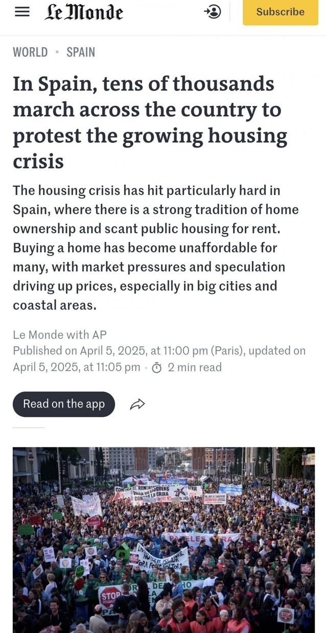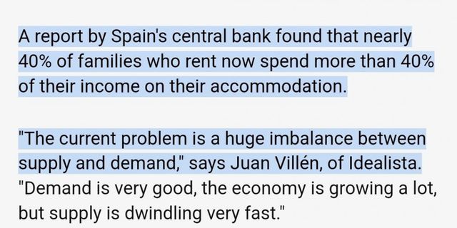 스페인 정부 통계 기준으로도 스페인 국민 40% 이상의 월급 40% 이상이 월세로 나가고 있으며 이는 전국 평균이고 양질의 일자리가 몰리는 대도시인 바르셀로나랑 마드리드는 더 심각해짐.