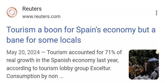 스페인 성장 증가분의 71% 는 관광업에서 비롯되었음. 그러니까 GDP 성장의 4분의 3을 사실상 관광업이 견인했다는거.