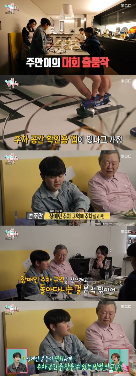 주차장에 관해 설명하던 주안 군은 "앱이 깔려있어서 앱이 켜진다. 주차장에 자동차가 들어가고, 장애인 주차 구역에 주차하면 초음파 센서가 감지한다"라며 덧붙였다.