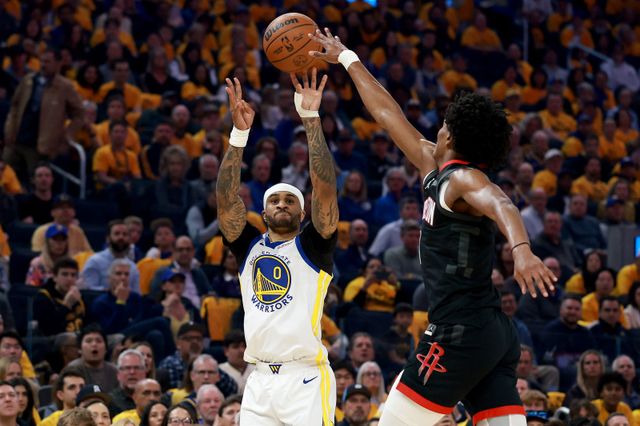SAN FRANCISCO, CALIFORNIA - APRIL 26: Gary Payton II #0 of the Golden State Warriors shoots over Amen Thompson #1 of the Houston Rockets in the first quarter of a game in Game Three of the Western Conference First Round NBA Playoffs at Chase Center on April 26, 2025 in San Francisco, California. NOTE TO USER: User expressly acknowledges and agrees that, by downloading and or using this photograph, User is consenting to the terms and conditions of the Getty Images License Agreement. Ezra Shaw/Getty Images/AFP (Photo by EZRA SHAW / GETTY IMAGES NORTH AMERICA / Getty Images via AFP)/2025-04-27 10:35:07/