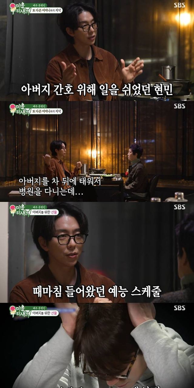 윤현민은 "아버지 투병생활할 때 쉬었지 않냐. 아빠 뒷좌석에 태워서 병원 가니까 아버지가 '너 이제 망했어? 너 왜 일 안 해'라고 하시더라. '아빠가 건강해져야 드라마를 찍지'라고 했다. 건강 회복하라고"라고 이야기했다. 그러면서 "집에 가서 생각해 보니까 아빠는 TV에 나오는 내 모습, 이게 어떻게 보면 아빠가 빨리 나을 수 있던 게 아니었을까 싶었다"라며 "회사에 가장 빨리 TV에 나올 수 있는 거 뭐 있냐고 하니까 드라마는 몇 개월 후에 나오니까 안되고, 예능이 하나 들어왔었는데 3주 있다 나갈 것 같다고 하더라. 그래서 그걸 하겠다고 했다. 다 찍었는데 첫 방송 전에 아버지가 돌아가셔서 너무 아쉬웠다"라며 눈시울을 붉혔다.