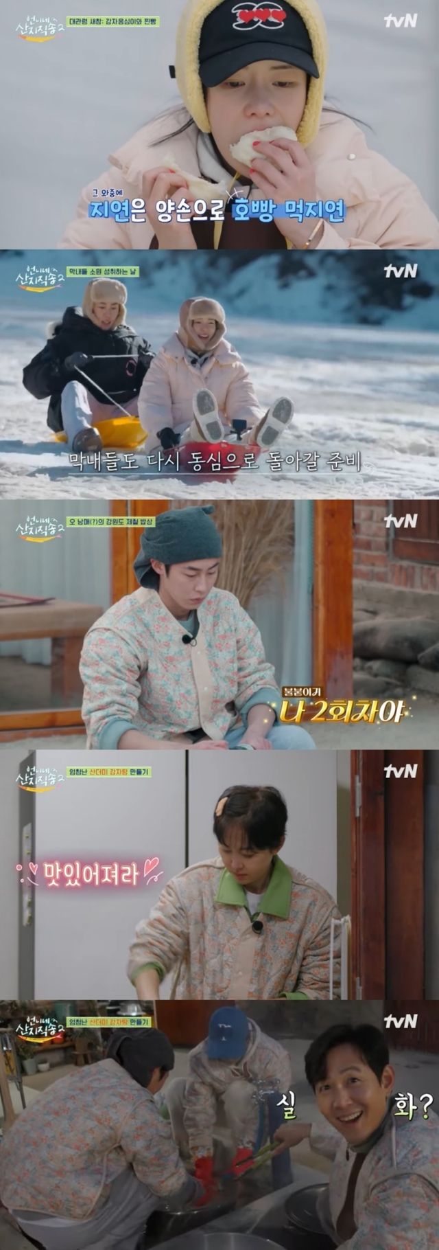 대관령 천연 썰매장을 방문한 사 남매와 이정재의 모습도 눈을 뗄 수 없게 했다. '언니네 산지직송2'의 새로운 계절을 제대로 만끽할 수 있었던 시간. 버킷리스트로 눈썰매 타기를 꼽았던 막내즈 임지연과 이재욱은 그 누구보다 신난 모습을 보였고, 얼음 선배 이정재와 염정아 역시 오랜만에 동심으로 돌아간 듯 눈썰매에 올라 쾌속 질주를 했다. 그런가 하면 썰매타기가 어색한 박준면은 의도하지 않은 브레이크가 걸리는 장면으로 현장을 폭소케 했다.
