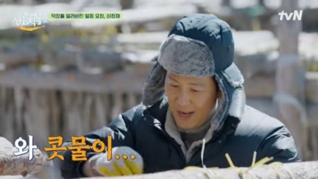 황태 120마리를 걸어야 비로소 한 목이 완성되는 고된 작업. 언니즈 염정아, 박준면과 막내즈 임지연, 이재욱이 2인 1조로 호흡을 맞춘 가운데 이정재는 허리를 펼 새도 없이 양쪽을 번갈아 도우며 작업 속도를 끌어올렸다. 이정재는 직송비에 진심인 가장 염정아를 향해 "(예능인데) 말도 안 하고 일만 하시네"라고 말해 폭소를 자아내기도.