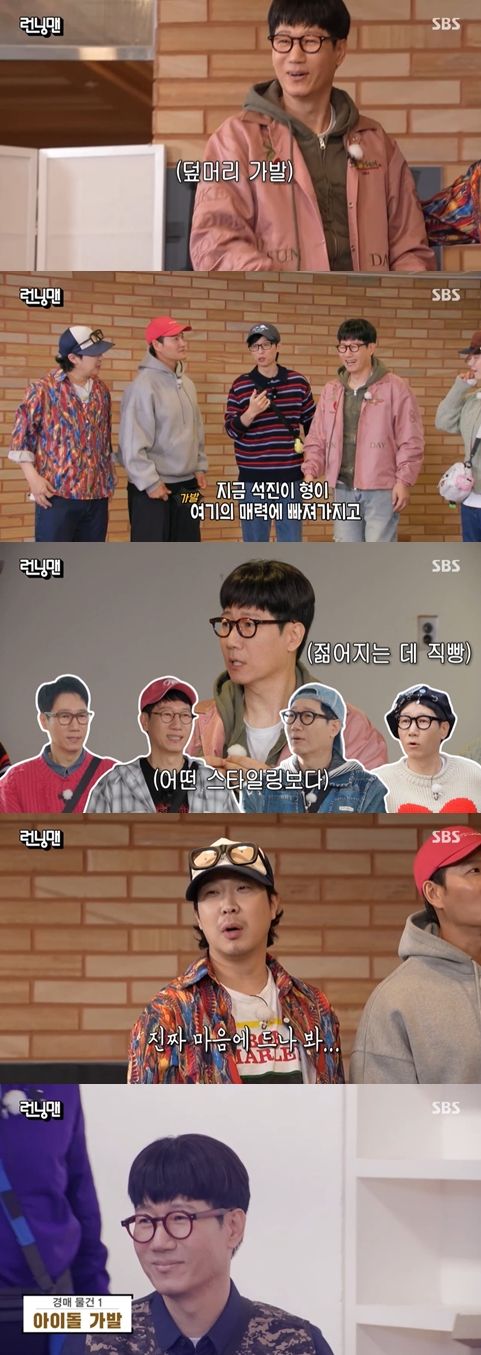 지난 '런닝 상인회'에서 경매 물건이었던 덮머리 가발을 착용하고 등장한 지석진은 "약속을 지켰습니다"라며 풍성한 머리카락을 자랑했다. 이를 본 유재석은 "석진이 형이 여기 매력에 빠졌다"라고 말했다.