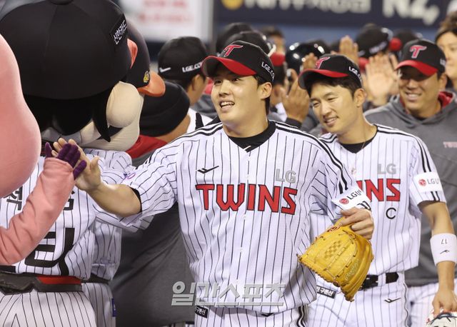 3월 27일 오후 잠실야구장에서 열린 2025 프로야구 한화 와 LG 경기. LG 선발 송승기가 7회 한화 공격을 무실점으로 막아내고 오스틴과 하이파이브하고있다. 잠실=정시종 기자 capa@edaily.co.kr