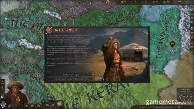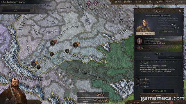 그 과정에서 새로운 북마크 테무친, 새해 축제 차강사르 등 몽골 문화와 전통을 경험할 수 있다. 특히 스텝 지대는 강수량이 적은 초원 지대이기에 땅의 비옥도가 계속 바뀌기에 거처를 자주 옮겨야 한다. 이러한 부분도 유목 정부로 구현된다. 지역을 옮겨 다니면서도 백성을 통솔하여 왕국을 안정적으로 통치해나가야 한다.