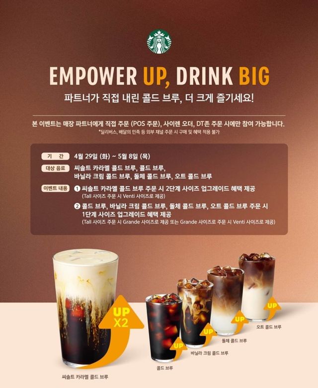 콜드 브루, 바닐라 크림 콜드 브루, 돌체 콜드 브루, 오트 콜드 브루는 한 단계씩 사이즈업을 적용하고, 이달의 프로모션 음료인 씨솔트 캐러멜 콜드 브루는 두 단계 사이즈업을 제공한다. 이에 따라 톨 사이즈 가격으로 벤티 사이즈 씨솔트 캐러멜 콜드 브루를 즐길 수 있다.