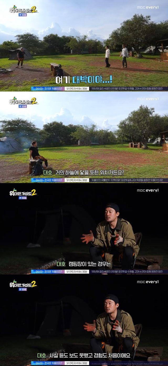 특히 평소 캠핑을 좋아하는 김대호는 "놀랍다. 야생 국립공원 안에 캠핑장이 있는 경우는 사실 듣도 보도 못했고 경험도 처음이다"며 "캠핑장에 들어왔을 때는 거의 하늘에 닿을 듯한 위치였다. 일상에서 벗어난 자유로운 느낌이었다"고 들뜬 마음을 보였다.