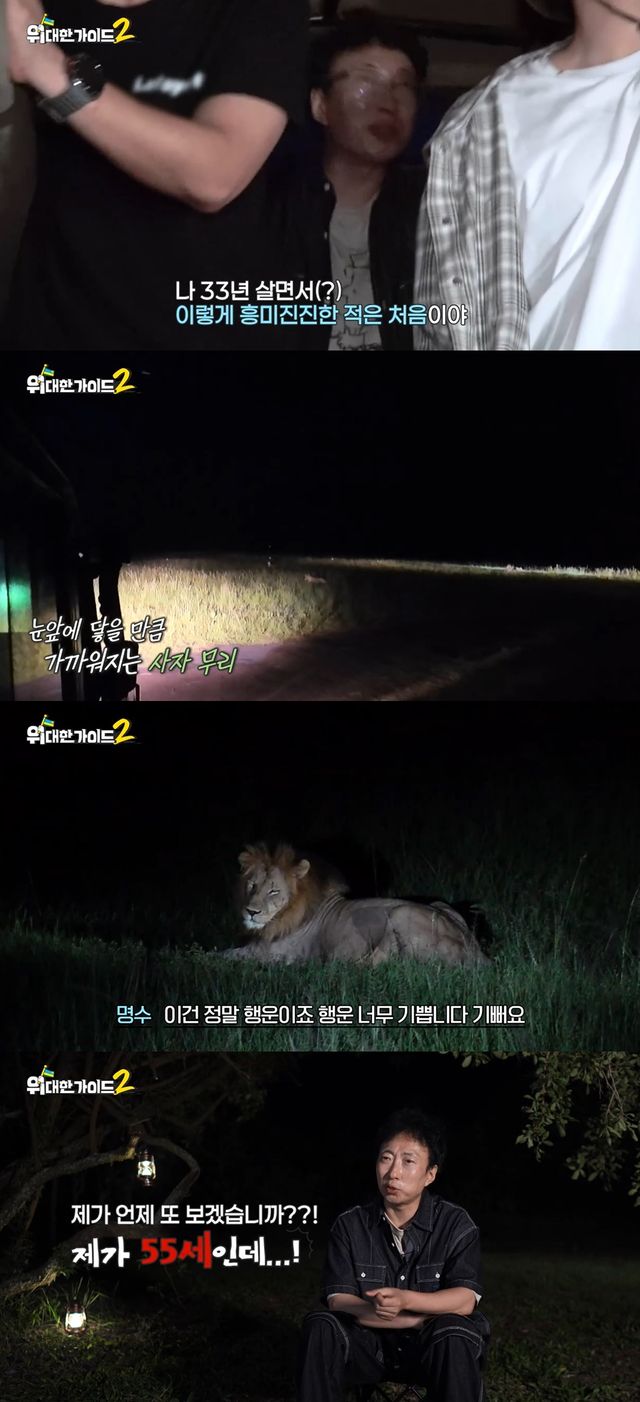 사자를 바라보며 박명수는 "우리가 운이 좋다"며 놀라움에 입을 벌렸다.