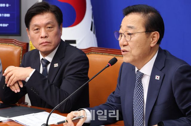 김윤덕 사무총장이 30일 오전 서울 여의도 국회에서 ‘진짜 대한민국 중앙선거대책위원회’ 구성 발표를 하고 있다.왼쪽은 조승래 수석대변인(사진=뉴시스)