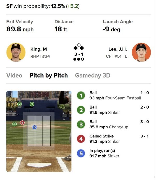 이정후는 0-4로 뒤진 6회 초 2사 1, 3루에서 선발 투수 마이클 킹과 승부했다. 킹은 이정후의 뜨거운 타격감을 의식해서인지 1~3구 모두 바깥쪽 볼을 던졌다. 4구 역시 스트라이크존을 벗어난 '볼'이었다. MLB 공식홈페이지 MLB닷컴의 게임데이에 따르면 스트라이크존에서 2개 정도 빠진 공이었다. 그러나 필 쿠지 구심은 스트라이크를 선언했다.