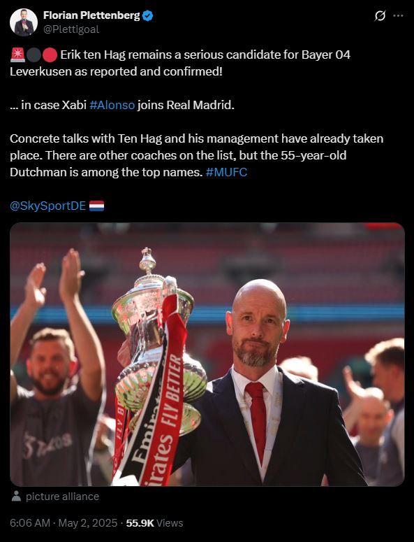 독일 '스카이스포츠'의 축구 전문 기자이자 소위 '1티어'인 플로리안 플레텐베르크 역시 자신의 사회관계망서비스(SNS)를 통해 "에릭 텐 하흐는 레버쿠젠의 진지한 감독 후보로, 그의 에이전트와 구체적인 협상이 이미 이뤄졌다. 다른 후보들도 있지만, 텐 하흐는 최우선 순위 중 하나"라고 밝혔다.