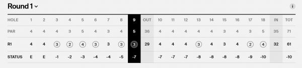 셰플러는 평균 드라이브 305.8야드, 최장타 322야드를 날리고, 페어웨이 안착률은 71.43%(10/14), 그린적중률 83.33%(15/18), 스크램블링 100%(3/3), 그린적중시 홀당 퍼트수는 1.40개를 기록했다.