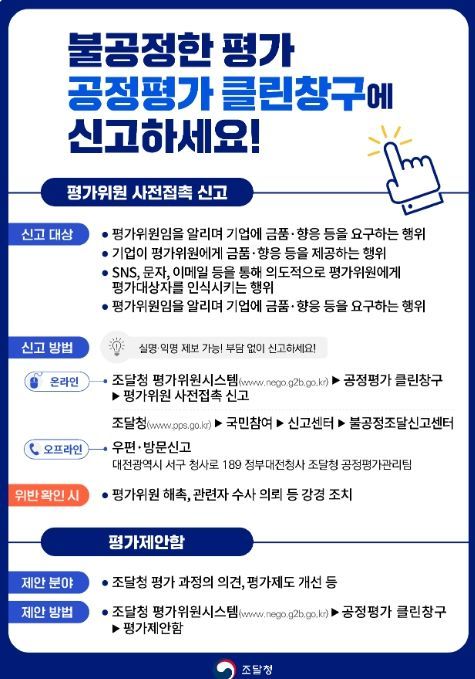 [와이뉴스] 조달청은 1일부터 조달평가 과정의 불공정 행위 근절을 위해 평가위원 사전접촉 신고센터의 익명 제보를 허용하고, 평가와 관련한 자유로운 의견 제출 기능을 추가한 ‘공정평가 클린창구’를 개설해 운영한다.