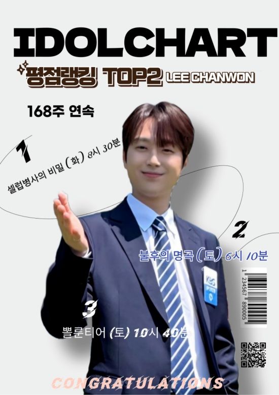아이돌차트는 최근 이찬원이 2025년 4월 4주 차 평점 랭킹에서 100,190표를 받아 2위에 올랐다고 밝혔다.