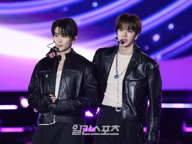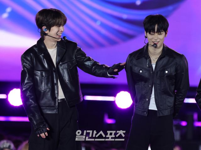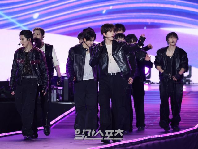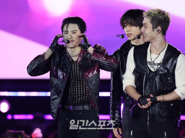 그룹 더보이즈가 지난 3일 인천 서구 아시아드주경기장에서 열린 'Trend wave Festival 2025 (트렌드웨이브 2025)'에서 관객과 소통하고 있다.