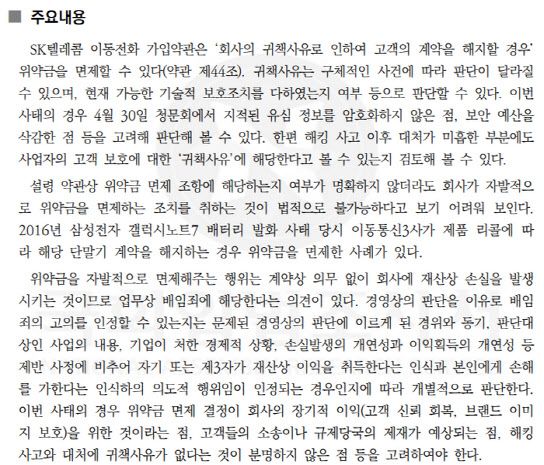 이어 “설령 해당 약관 조항에 명시적으로 해당하지 않더라도, SK텔레콤이 자발적으로 위약금을 면제하는 것은 약관규제법상 계약 당사자 간 불가능하다고 보기 어렵다”며 “과거 삼성전자 갤럭시노트7 발화 사태 당시 이동통신 3사가 위약금을 면제했던 선례처럼, 위약금을 면제한 사례가 있다“고 강조했다.