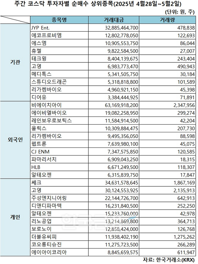 기관 'JYP Ent.'·외인 '비에이치아이'·개인 '쎄크' 1위 [주간 코스닥 순매수- 2025년 4월28일~5월2일]