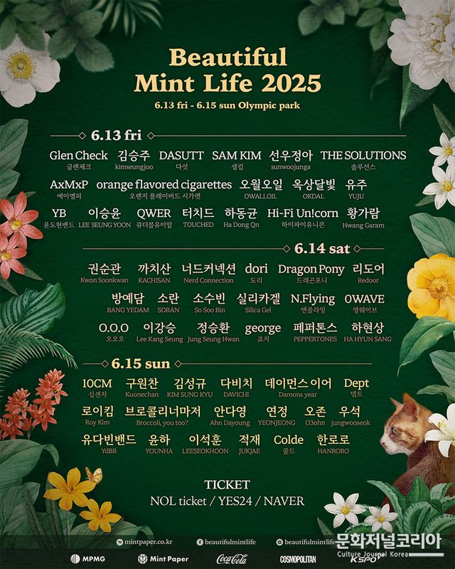 문화저널코리아 김영일 기자 | 6월 13일부터 15일까지 송파구 올림픽공원에서 개최될 예정인 ‘뷰티풀 민트 라이프 2025(Beautiful Mint Life 2025, 이하 뷰민라)’가 새롭게 합류한 9팀을 포함한 최종 라인업을 공개했다. 국내 최정상 아티스트와 떠오르는 신예들이 어우러진 최종 라인업은 높은 완성도를 자랑해 관객들의 기대를 모으고 있다.