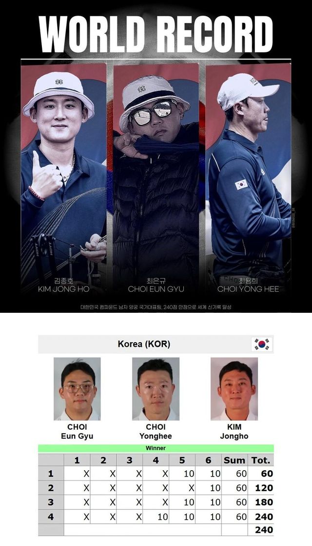양궁 컴파운드 한국 대표팀이 24발의 화살 전부 10점을 쏴서