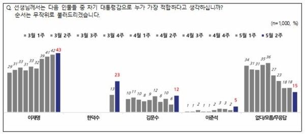 한 후보에 이어 김문수 국민의힘 후보 12%, 이준석 개혁신당 후보 5% 등의 순이었다. 적합한 후보가 없다거나 모른다고 한 유보층은 15%였다.