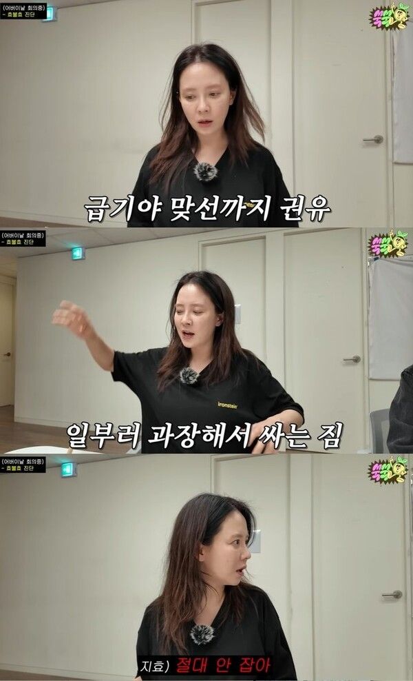 송지효는 "'이 이상은 싸우지 말자'라는 거였다"며 "너무 자주 싸우니까 제한하자는 거다. 엄마, 아빠한테도 1년에 몇 번 싸울 거냐고 묻고 4번 정도라고 답하면 이후에 싸울 기미가 보이면 '4번 찼으니까 싸우면 안 된다'라고 했다. 이렇게 서로 유머러스하게 넘어가게 노력했다"고 했다.
