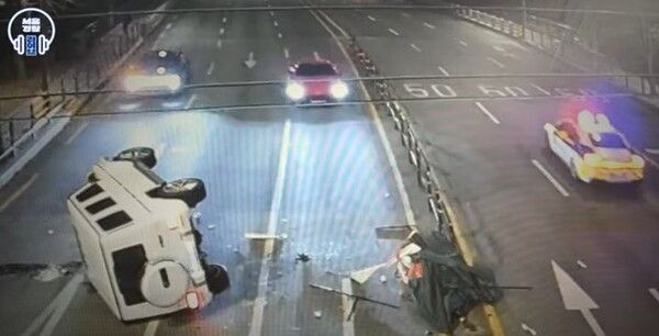 영상은 오전 1시 30분께 서울의 한 도로에서 중앙 분리대를 향해 빠른 속도로 달리다 충돌해 전도된 차량의 모습으로 시작된다.