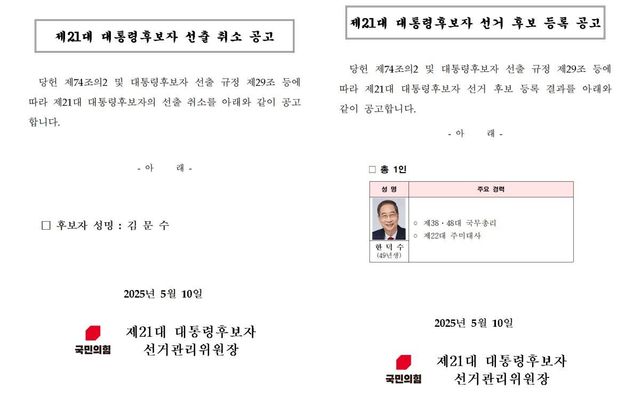 10일 새벽 국민의힘 홈페이지에 공고된 김문수 제21대 대통령후보자 선출 취소 공고 및 한덕수 후보 등록 공고문. 국민의힘은 이날 새벽 김문수 후보의 대선 후보 자격을 취소하고 한덕수 후보를 단독으로 등록했다. / 뉴스1